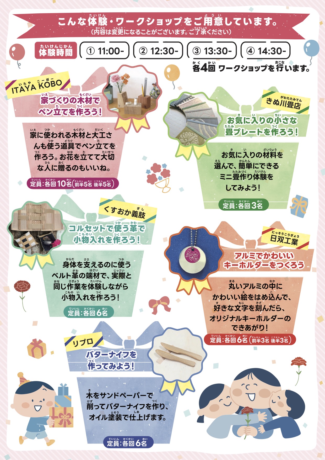 11:00~、12:30~、13:30~、14:30 ~の計4回ワークショップを行います。
